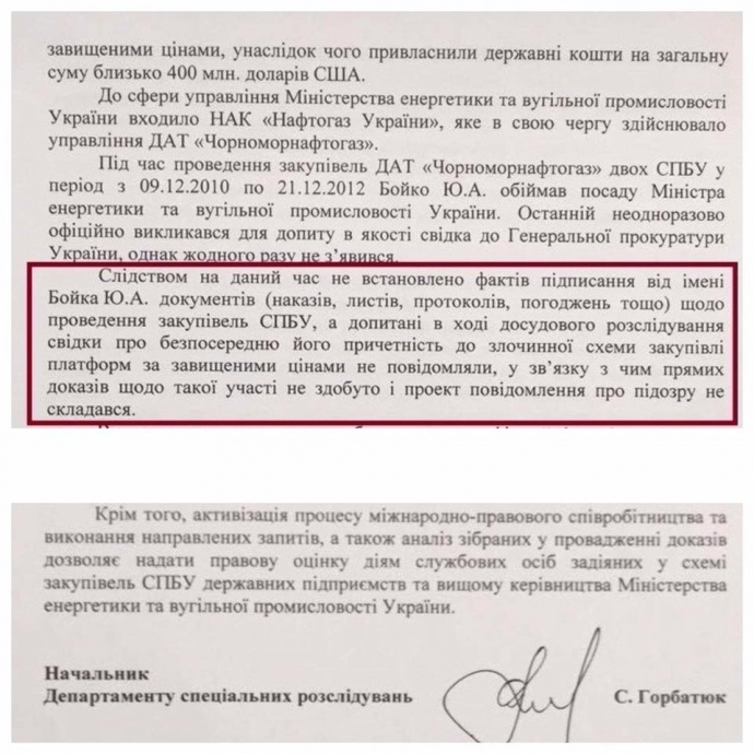 "Слідством на даний час не встановлено фактів підписання від імені Ю. Бойка документів (наказів, листів, протоколів, погоджень тощо) щодо проведення закупівель СПБУ, а допитані в ході досудового розслідування свідки про безпосередню його причетність до злочинної схеми закупівлі платформ за завищеними цінами не повідомляли, у зв'язку з чим прямих доказів щодо такої участі не здобуто і проект повідомлення про підозру не складався", - зазначили в ГПУ.
