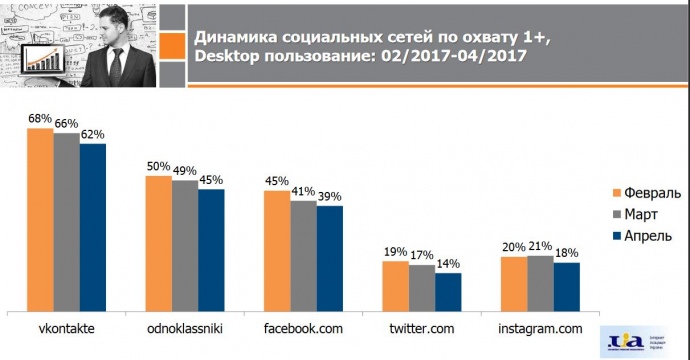 Так, щоквартальні дослідження онлайнової поведінки від Інтернет асоціації України показують, що "Вконтакте" та "Одноклассники" є більш популярними соціальними мережами, ніж Facebook та Twitter серед українських інтернет користувачів.