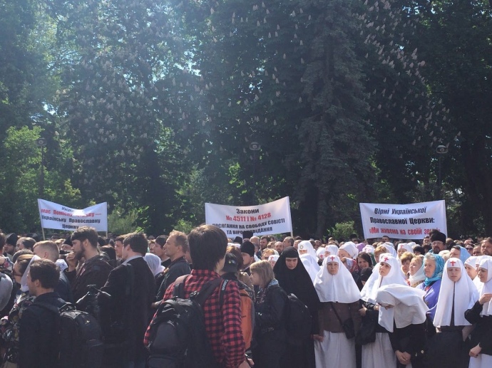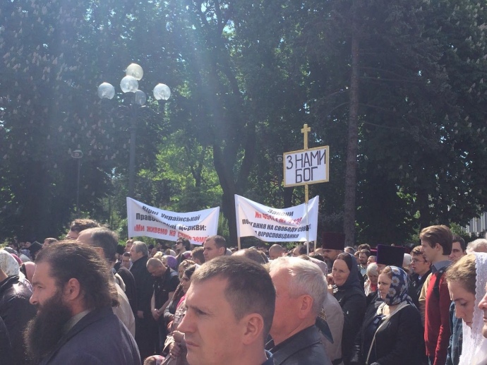Як було оголошено, УПЦ МП проводить молебень на знак протесту проти двох проектів законів: про особливий статус релігійних організацій, "керівні центри" яких знаходяться в державі-агресорі щодо України, і про внесення змін до закону "Про свободу совісті та релігійні організації" щодо зміни релігійними громадами підлеглості.