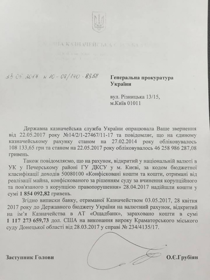 Також зазначається, що на казначейському рахунку станом на 27 лютого 2014 року знаходилося 108 134 гривні, а станом на 22 травня 2017 року там вже було 46 258 986 287 грн.