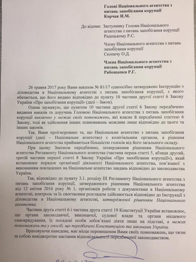Рябошапка показав листа, якого написав голові НАЗК. В ньому він попереджає Корчак, що її дії – це перевищення службових повноважень, яке тягне за собою відповідальність.