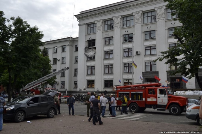 – Бій на Луганщині. Терористи штурмують Луганський прикордонний загін. Вогонь ведуть і з житлових будинків.