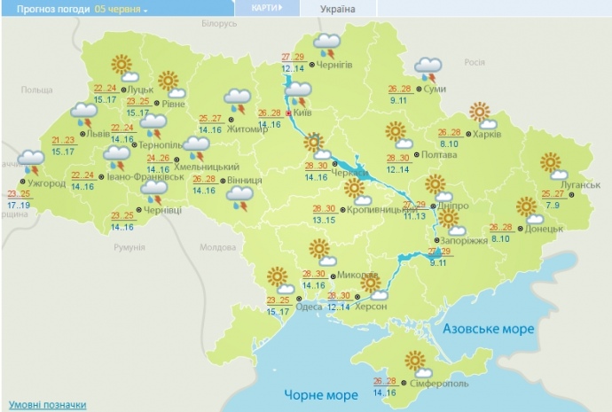 У Києві 5 червня вночі без опадів, вдень короткочасний дощ, грози, місцями шквали 15-20 м/с. Температура вночі 14-16°, вдень 26-28°.