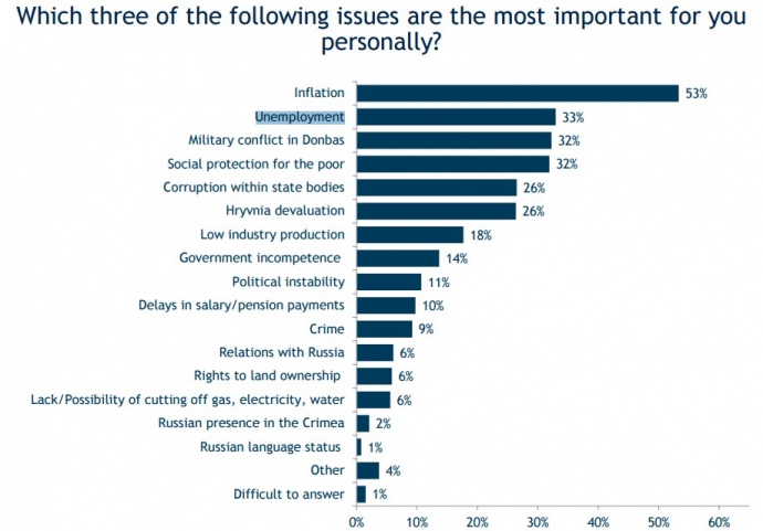 Для себе особисто українці вважають головними проблемами знецінення гривні, безробіття і війну на Донбасі.