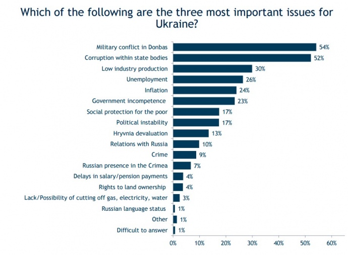 Головними проблемами для України опитані називають війну на Донбасі, корупцію чиновників і низький рівень промислового виробництва.