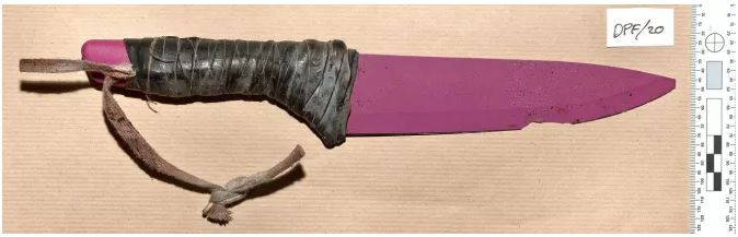 Поліція також оприлюднила фото одного з 12-дюймових керамічних ножів рожевого кольору, якими орудували злочинці під час нападу. До ручки ножа клейкою стрічкою примотано шкіряний ремінець, очевидно, щоб його можна було повісити на зап'ясті.