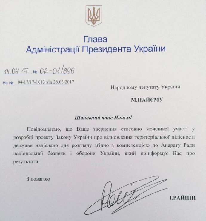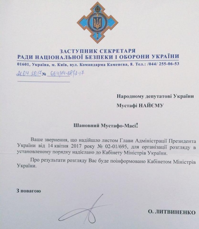 Про це у своєму Facebook написав депутат Мустафа Найєм, публікуючи відповіді з АП, Кабміну і РНБО.