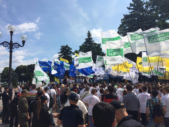 Мітингувальники стоять з прапорами різних політичних сил, які вимагають прийняття нового виборчого закону: ДемАльянс, Хвиля, Громадянська платформа, Рух нових сил, Свобода і Самопоміч.