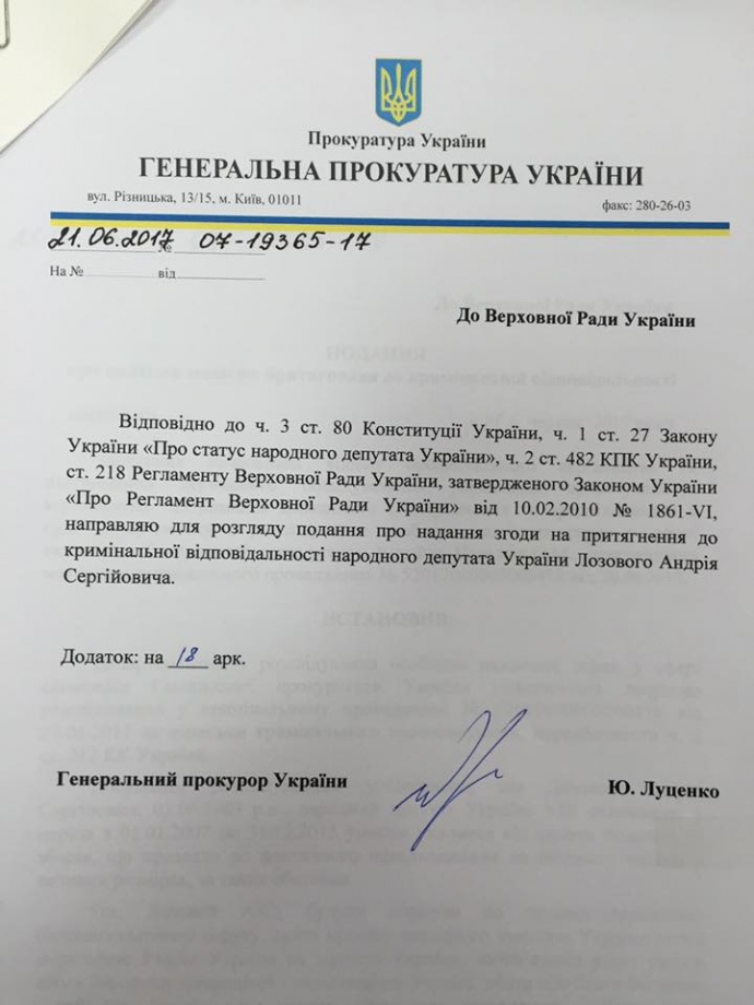 Генеральна прокуратура направила до Верховної Ради прохання надати дозвіл на притягнення до кримінальної відповідальності депутата з фракції Радикальної партії Андрія Лозового.