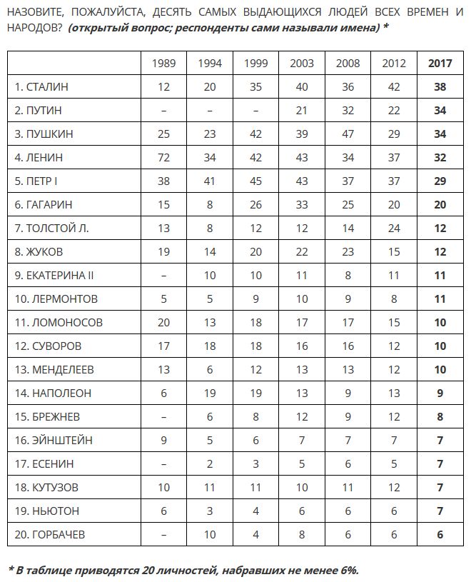 Соціологи просили росіян назвати найвидатніших людей усіх часів і народів, пропонуючи респондентам самим назвати імена. У рейтинг потрапили 20 осіб, які набрали не менше 6% згадок.