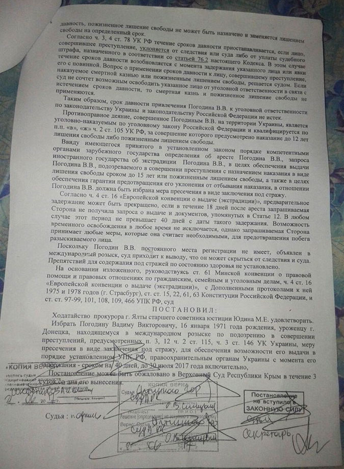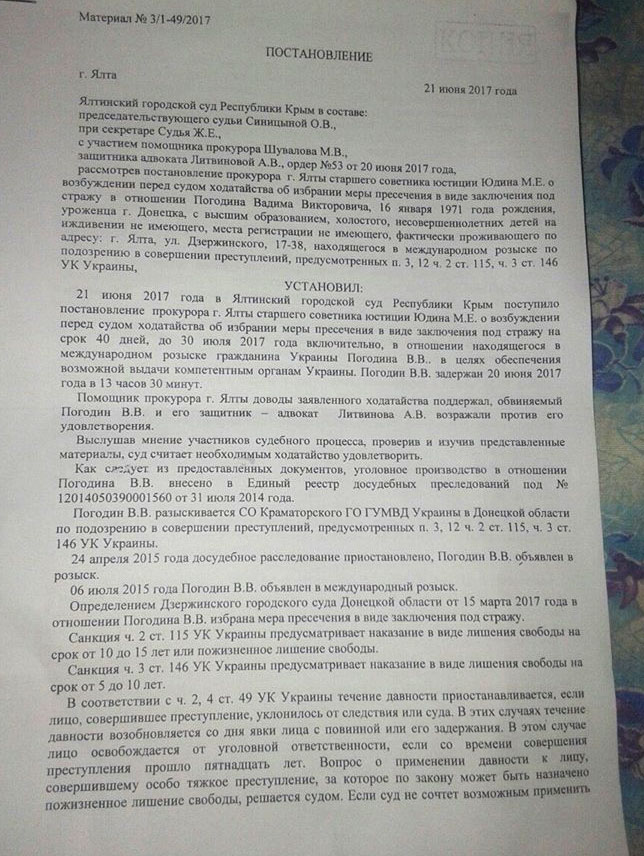 У Генпрокуратурі "Українській правді" повідомили, що Погодін "21.06.17 затриманий по лінії Інтерполу в Криму. До нього за рішенням Ялтинського суду застосовано тимчасовий арешт. Розшукується за поданням слідчого відділу Краматорського управління поліції за вбивство".