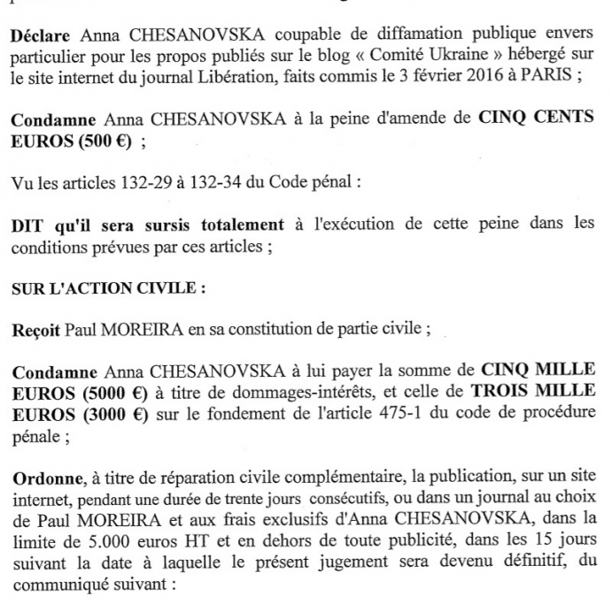 Паризький суд виніс рішення проти української перекладачки Анни Чесановської через її критику на адресу скандально відомого режисера Пола Морейри, автора фільму "Україна, маски революції", зобов’язавши її сплатити штраф та компенсацію, які можуть перевищити 13,6 тисяч євро.