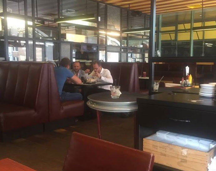 Це "фото п'ятничного обіду в. о. керівника регламентного комітету і одного з фігурантів розслідування НАБУ Полякова в Арені". За інформацією УП, це заклад "The Burger".