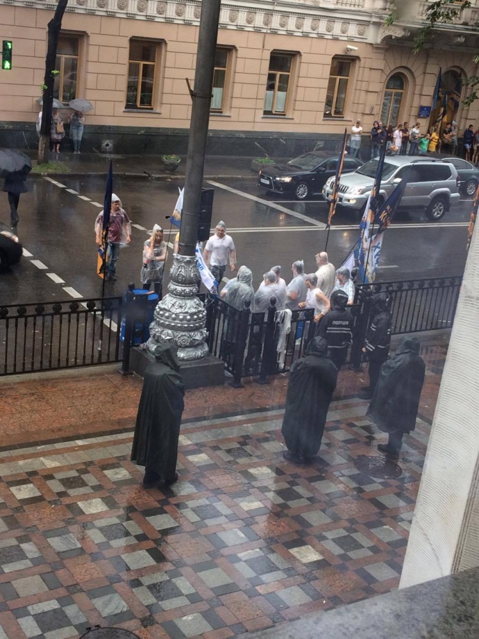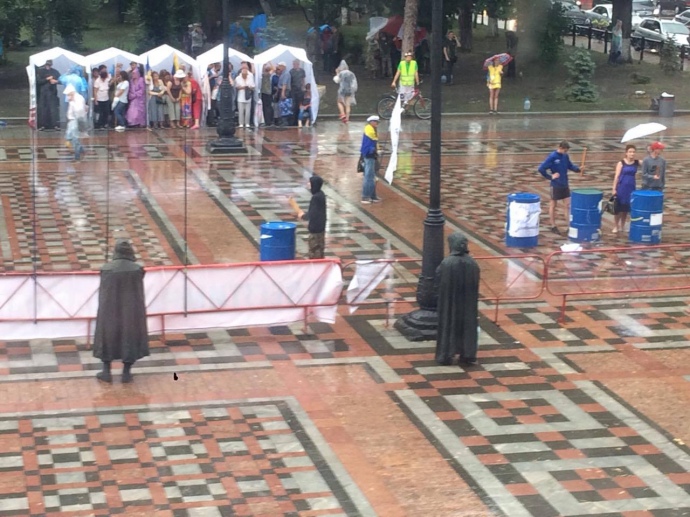 Частина активістів ховається від грози по наметах та на сцені, натомість інша частина – вдягла дощовики та продовжує блокування парламенту.