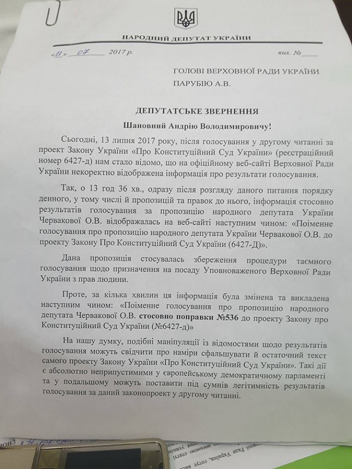 "Так, о 13 год 36 хв., одразу після розгляду даного питання порядку денного, у тому числі й пропозицій та правок до нього, інформація стосовно результатів голосування за пропозицію народного депутата України Червакової відображалась на веб-сайті наступним чином: "Поіменне голосування про пропозицію народного депутата України Червакової до проекту Закону Про Конституційний Суд України (6427-Д)", - зазначається у заяві.