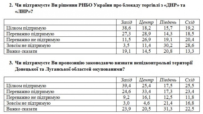 Так, рішення Ради національної безпеки й оборони України про блокаду торгівлі з "ДНР" та "ЛНР" підтримують 47% опитаних, проти – 37%. Найвища підтримка блокади на заході (66%), відчутно нижча у центрі (47%). На півдні прихильників цього навіть менше, ніж сході (30% і 38%).