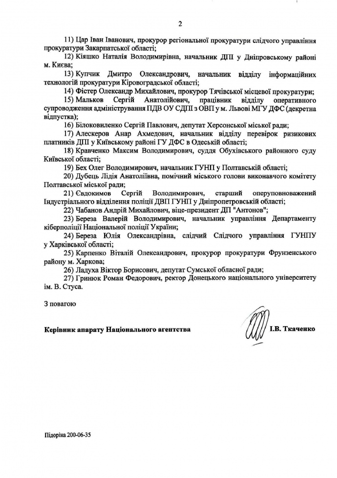 Згідно з документом, проводиться повна перевірка декларацій Ірпінського міського голови Володимира Карплюка, депутата Херсонської міськради Сергія Білоковиленка, депутата Сумської облради – Віктора Ладухи.