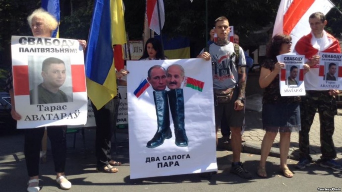Крім того, в руках учасників і портрети білоруського добровольця Тараса Аватарова, який засуджений в Білорусі на п'ять років позбавлення волі.