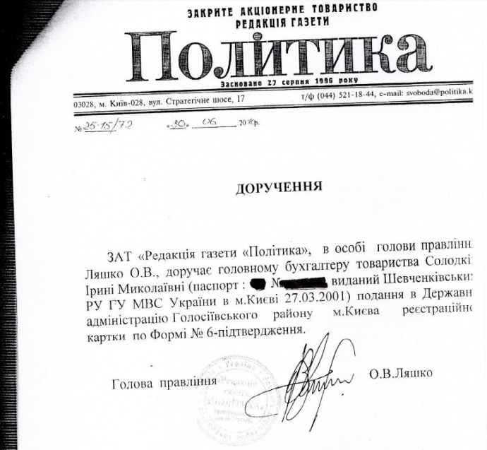 За даними НАЗК, також в агентства наявні документи (доручення та довіреність), підписані Ляшком як головою правління ЗАТ "Редакція газети "Політика".