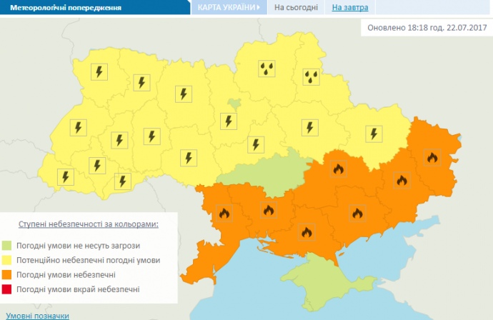 22-24 липня в Одеській, Миколаївській, Херсонській, Запорізькій, Луганській, Донецькій, Харківській, більшості районів Дніпропетровської та Вінницької областей переважатиме надзвичайний рівень пожежної небезпеки.