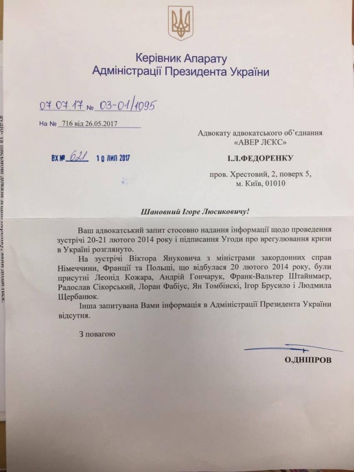 "Ми отримали нещодавно відповідь з Адміністрації президента про те, що в них немає жодної інформації про обставини підписання угоди про 21 лютого", - зазначив він.