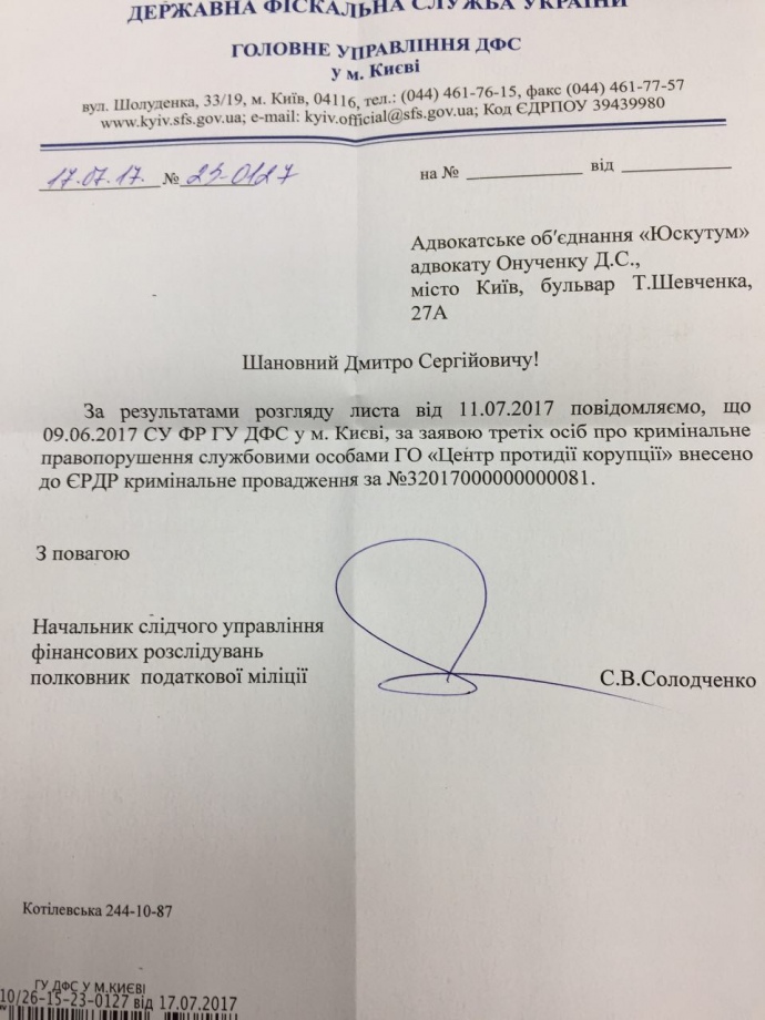"За результатами розгляду листа від 11.07.2017 повідомляємо, що 09.06.2017 СУ ФР ГУ ДФС у м. Києві, за заявою третіх осіб про кримінальне правопорушення службовими особами ГО "Центр протидії корупції" внесено до ЄРДР кримінальне провадження за №32017000000000081", – йдеться у документі, який є в розпорядженні ЦПК.