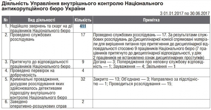 З 1 січня по 30 червня цього року Національне антикорупційне бюро України отримало 411 скарг на своїх співробітників.