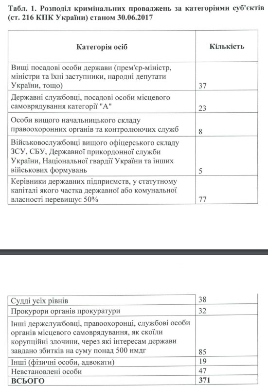 Станом на 30 червня Національне антикорупційне бюро відкрило кримінальні провадження щодо 37 найвищих посадовців країни, проте не уточнили за якими статтями.