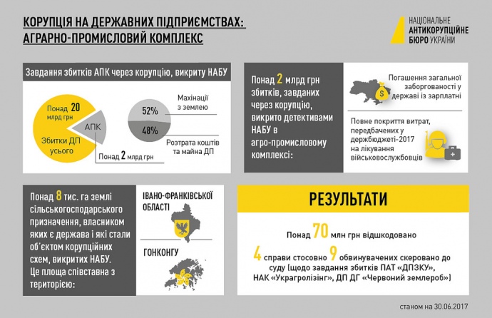 Згідно з інформацією, корупція в галузі АПК – це переважно махінації із землею та розтрата коштів і майна державних підприємств.