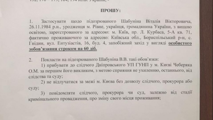 Як відомо, у середу, 16 серпня 2017 року, слідчий слідчого відділу Дніпровського управління поліції Головного управління Національної поліції за процесуального керівництва Київської місцевої прокуратури №4 повідомив про підозру голові правління ГО "Центр протидії корупції" Віталію Шабуніну.