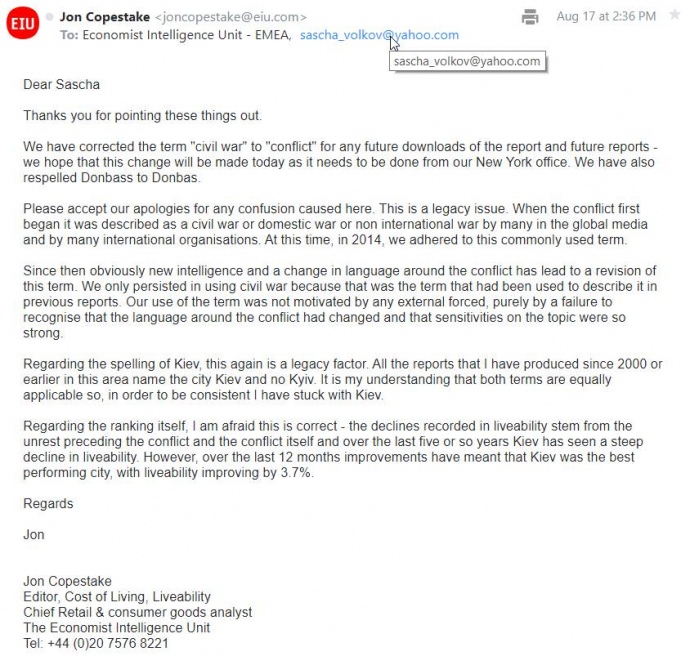 Представник The Economist Intelligence Unit надіслав у Посольство України та Олександру Волкову майже ідентичні листи-відповіді, у яких вибачилися за використання словосполучення "громадянська війна на Донбасі".