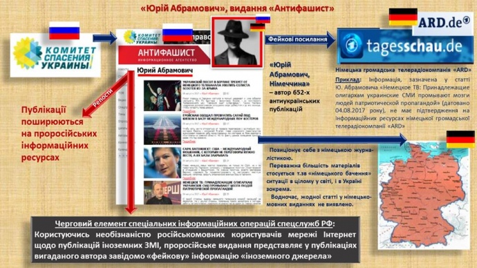 Зокрема, нещодавно СБУ звернуло увагу на псевдожурналіста Юрія Абрамовича, який постійно публікується на проросійському інформаційному ресурсі "Антифашист".