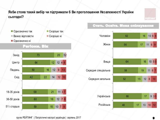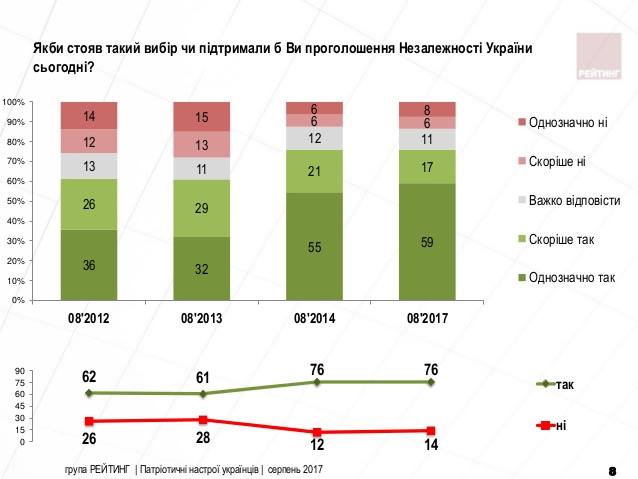 76% опитаних заявили, що вони б підтримали проголошення Незалежності України. Організатори опитування запевняють, що за останні три роки загальна кількість тих, хто підтримує незалежність України не змінилася. А ось в порівнянні з 2013 роком збільшилась на 15%.