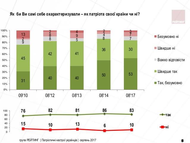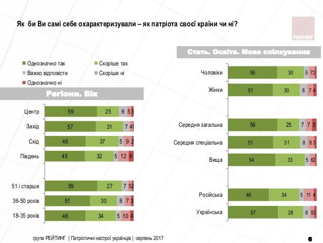 Водночас у південних областях 18% опитаних заявили, що не можуть говорити про себе, як про патріотів своєї країни. На Сході таких респондентів – 11%, у Центрі – 8%, на Заході – 5%. Соціологи зазначають, що чим старші респонденти, тим більше серед них тих, хто вважає себе патріотом.