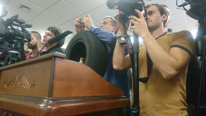 Коли засідання розпочалося, Луценко зайшов до зали суду з автомобільною шиною в руках.