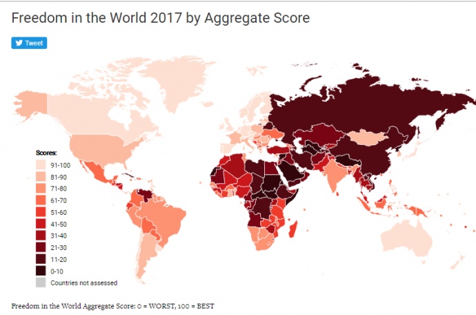 За оцінкою Freedom House, cвобода у анексованому Криму, як і в Росії обчислюється від 0 до 10 балів, що є найгіршим показником (максимальна кількість балів - 100).