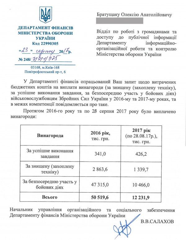 Про це пише журналіст Олексій Братущак у своєму блозі на "Українській правді", посилаючись на відповідь Міністерства оборони про виплати винагород бійцям.