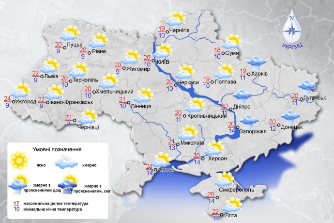 Згідно з прогнозом, температура вночі на заході – 7-12°, у південних областях 11-16°; вдень 17-22°, на Закарпатті та Прикарпатті місцями 23-25°; на високогір'ї Карпат вночі 4-9° тепла, вдень 13-18°.