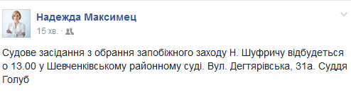 Судове засідання з обрання запобіжного заходу сину народного депутата від "Опозиційного блоку" Нестору Шуфричу відбудеться 30 серпня у Шевченківському районному суді.