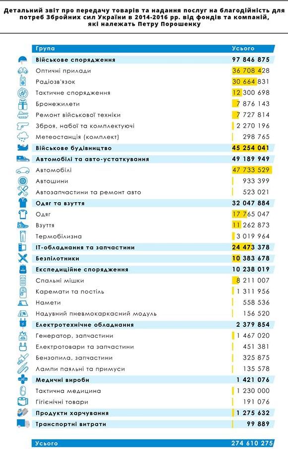 Фонд Петра Порошенка у травні звітував про те, що за 2014-2016 роки пожертвував понад 700 мільйонів гривень на благодійність, із них половину нібито витратили на потреби армії, а ще 350 мільйонів – на соціальні та інфраструктурні проекти.