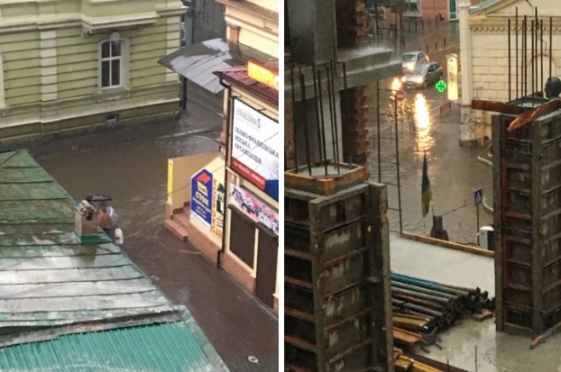 Через сильну грозу у центрі Івано-Франківська затопило дорогу, рух паралізовано.