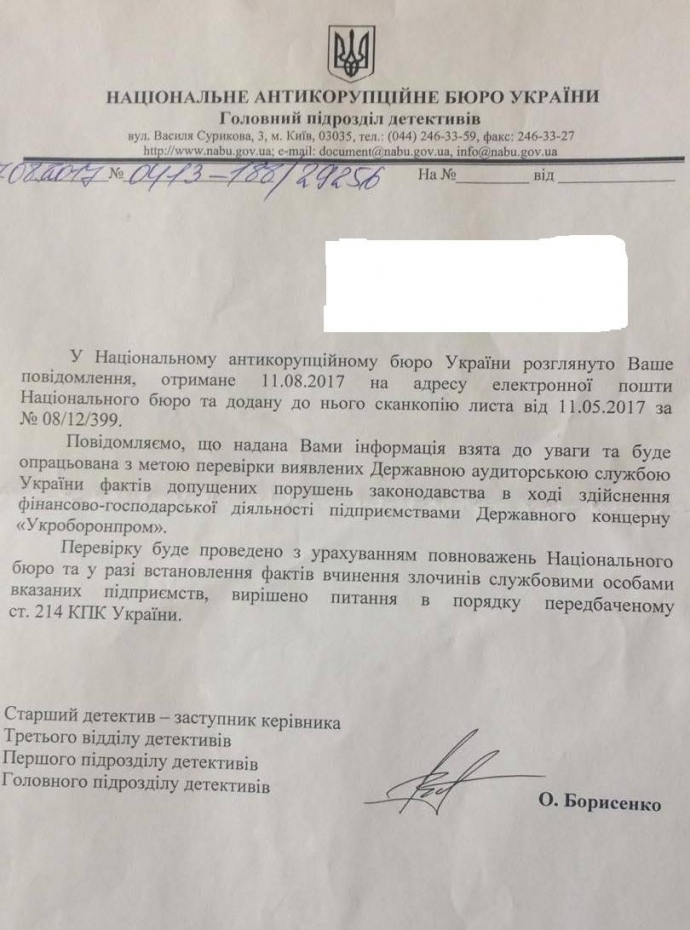 Національне антикорупційне бюро проведе перевірку виявлених Державною аудиторською службою України фактів допущених порушень законодавства в ході здійснення фінансово-господарської діяльності підприємствами Державного концерну "Укроборонпром".