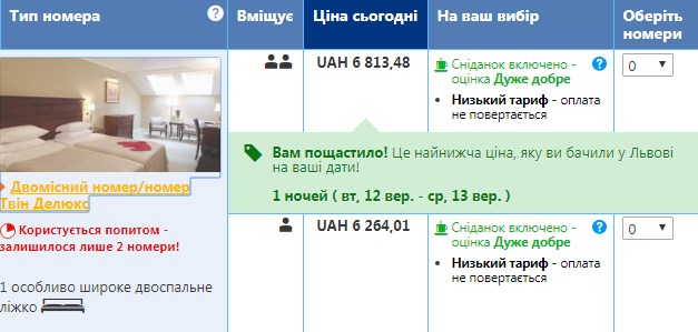 Так, зняти двомісний стандартний номер на добу з 12 на 13 вересня коштує 6 тисяч 264 грн.