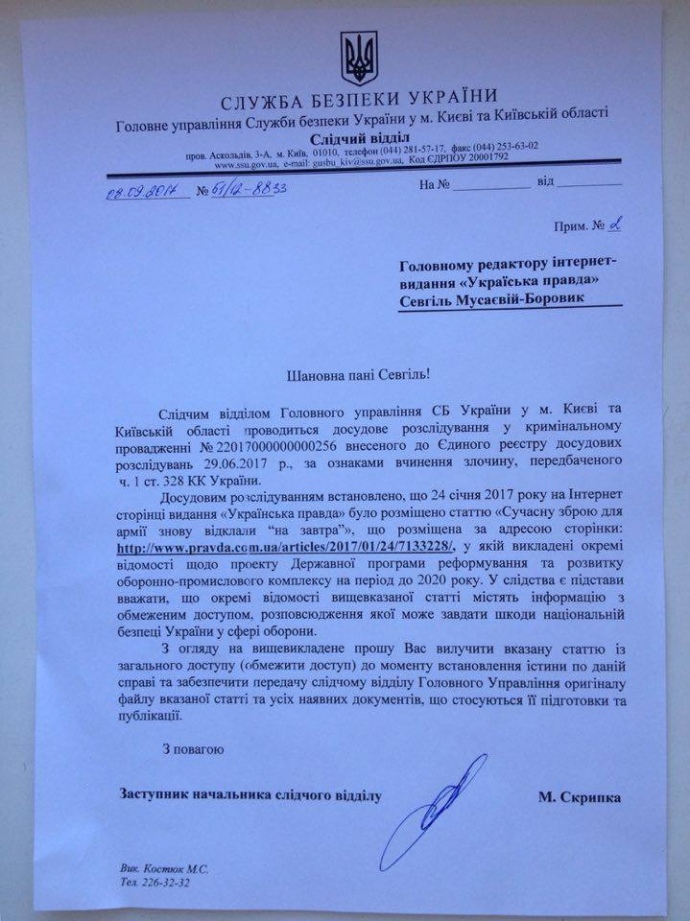 У листі зокрема сказано, що слідчим відділом Головного управління СБУ в Києві та Київській області проводиться досудове розслідування у кримінальному провадженні №22017000000000256, внесеного до Єдиного реєстру досудових розслідувань 29 червня 2017 року за ознаками вчинення злочину, передбаченого за ч.1 ст. 328 КК України ("Розголошення державної таємниці").