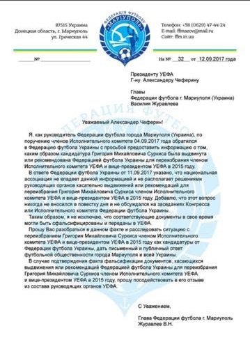 Президент Федерації футболу Маріуполя Василь Журавльов просить президента УЄФА Александра Чеферіна перевірити легітимність обрання Григорія Суркіса віце-президентом та членом Виконкому УЄФА у 2015 році.