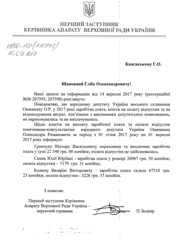 При цьому помічнику-консультанту на оплатній основі Віктору Васильовичу Гринчуку нарахована та виплачена зарплатня у сумі 22540 гривень за період з 1 січня по 1 вересня. Він не отримував оплати відпустки. Гринчук крім того, що є помічником Онищенка, є депутатом Київської облради. Він входить до фракції "Батьківщини".