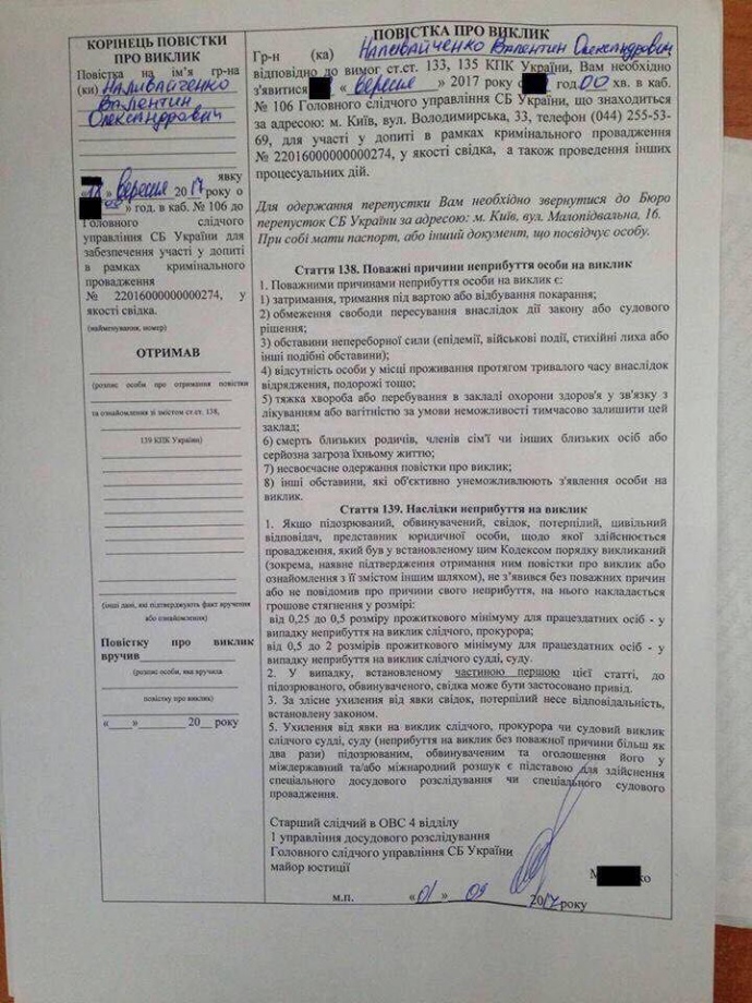 Згідно з повісткою, копію якої має "Українська правда", Наливайченка викликали на допит як свідка, а також "для проведення інших процесуальних дій".