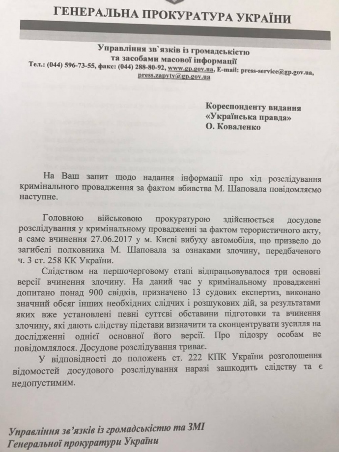 Слідчі Генпрокуратури сконцентрувалися на одній версії теракту, внаслідок якого загинув один із керівників Головного управління розвідки Міністерства оборони Максим Шаповал.