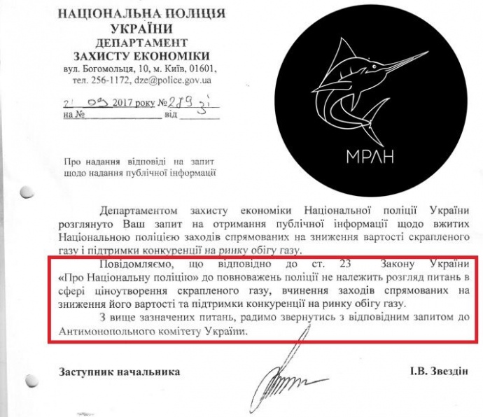 "До повноважень поліції не належить розгляд питань в сфері ціноутворення скрапленого газу, вчинення заходів спрямованих на зниження його вартості та підтримки конкуренції на ринку обігу газу. З вище зазначених питань, радимо звернутися з відповідним запитом до Антимонопольного комітету України", - повідомив заступник начальника Департаменту захисту економіки Національної поліції України Ігор Звездін.