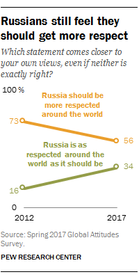 Сьогодні 56% російських громадян вважають, що Москва повинна бути високо оцінена в усьому світі. Близько третини вважає, що Росія отримує належну кількість поваги. У 2012 році такої думки дотримувалися 16% жителів РФ.